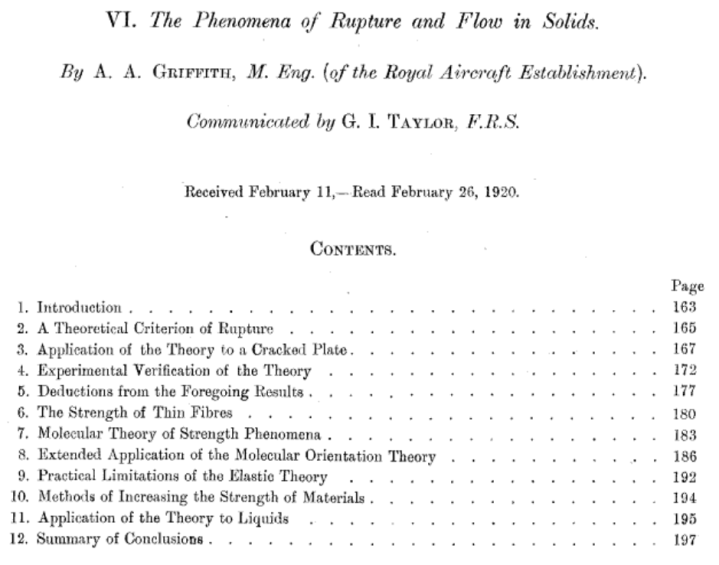 1921年,A.A.Griffith提议表面:任何材料的断裂强度皆由其劣势所决定。他预言,一种实在皑皑无瑕的材料,其“表面分子拉伸强度”轻便等于其弹性模量的九分之一。