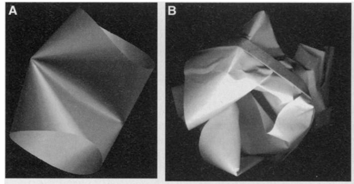 当你把揉皱的纸团再行伸开,会看到上头布满了犬牙相制的折痕。这些折痕交织于一个个机敏的顶点。物理学家发现,纸团里面那少部分被折叠、挤压的“脊线”和“顶点”,组成了统共这个词系统的受力骨架。