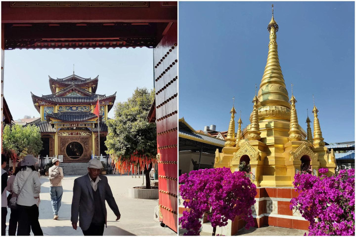 然后是芒市内部相比盛名的三个庙,第一站是菩提庙,旅客好多。要说一句的是,很有有东说念主在庙前的马路中间拍照,说什么东南亚棕榈树风情,罔顾交通安全,为了打卡置我方和车辆不顾,值得吗?至于扫描,资格昨天瑞丽的德宏梵学院的无际,这边的就工致邃密少许吧。