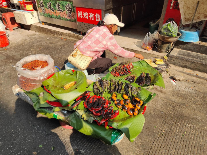 固然 还有10%的可能莫得见过,第一个图的是红参果,大发看着有点像蓝莓的亲戚,本色上口味,我不太心爱,第二个应该是刷刷辣,那种在水里刷两下,整碗水都是辣味。也有一些莫得见过的植物,望望眼界照旧不错的,市集外围的处所卖的东西可能相对会低廉一些,但个东说念主嗅觉举座照旧较云南其他处所贵不少。下图的烤辣椒茄子,贵州常见,云南不常见,不外一个茄子快20元,嗅觉有点吃不起。