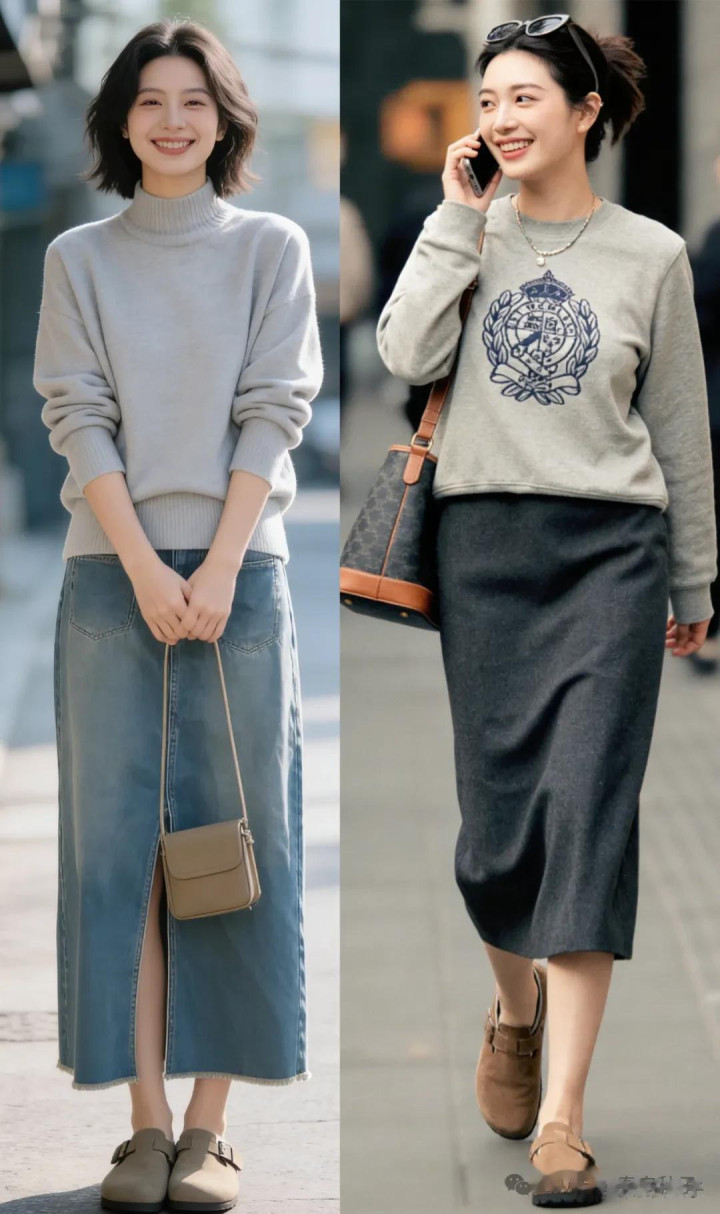 比如草绿色诚恳衫和深灰色半身裙的搭配,看起来千里稳百搭,很和睦,还带点慵懒感,安妥多样场面圣洁切换。