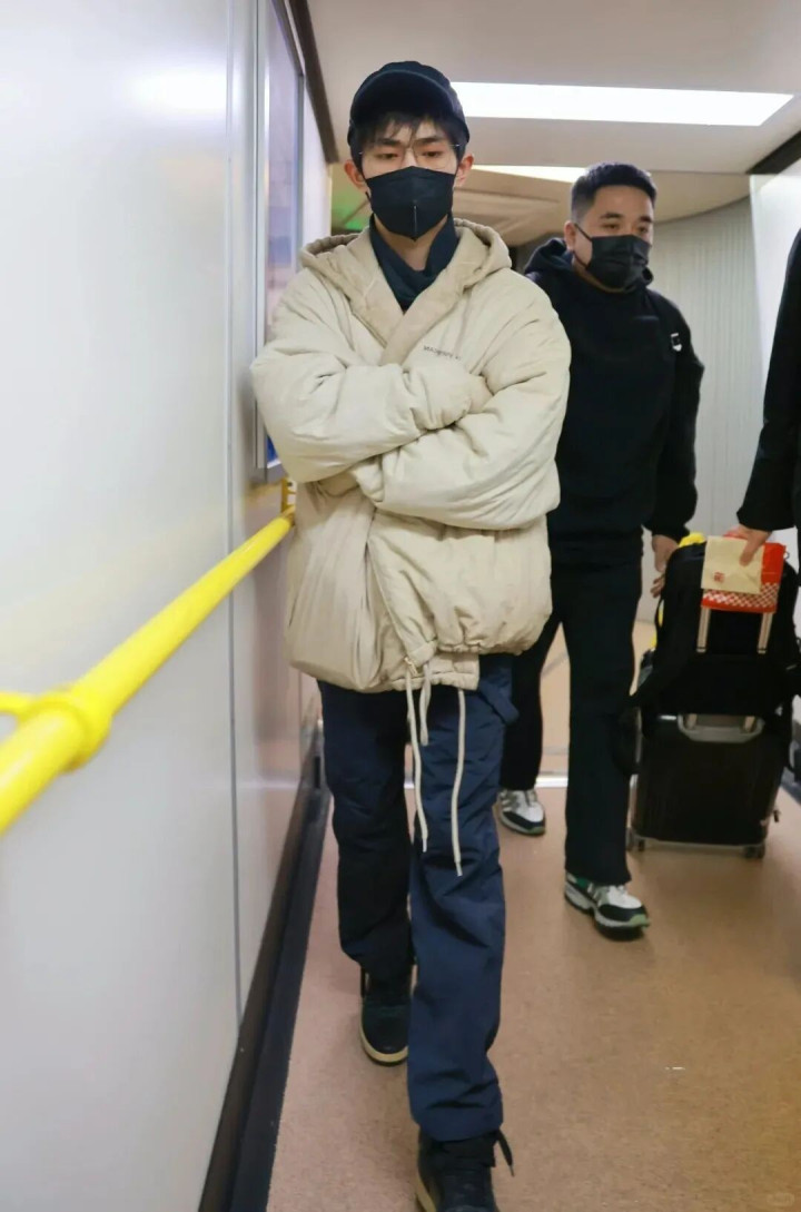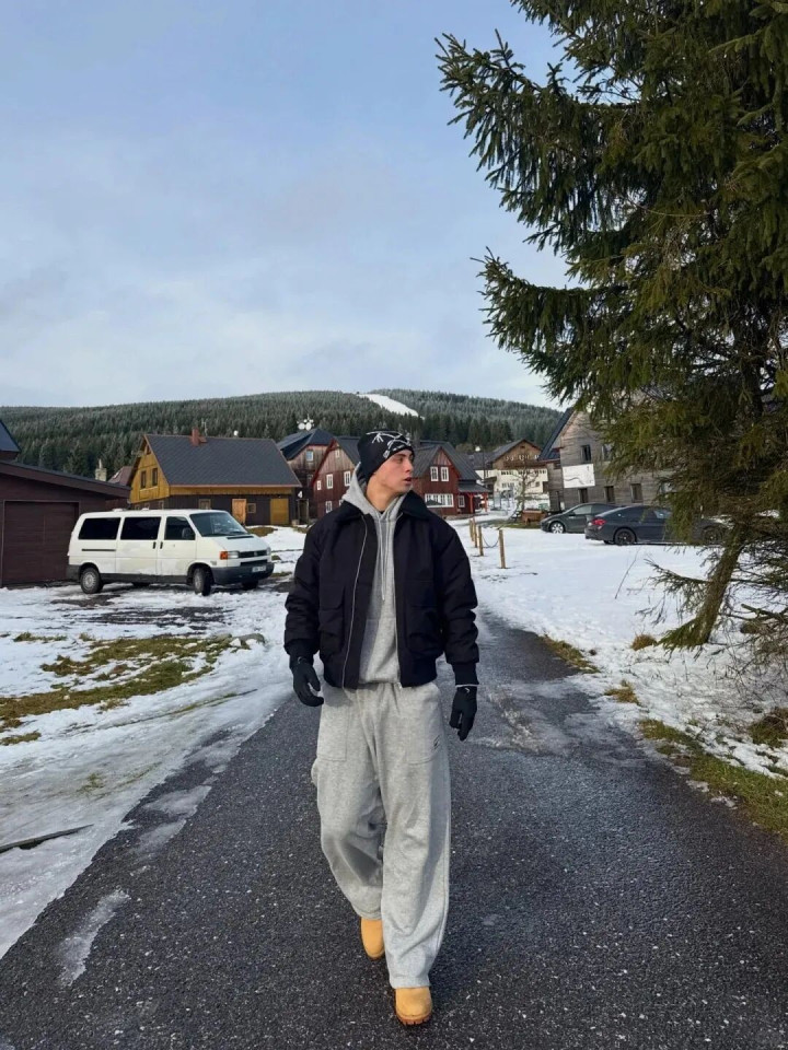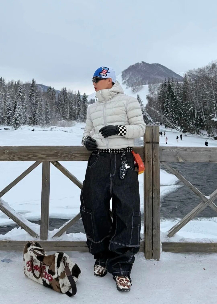 面包服 + 白 T 叠穿/卫衣 + 卫裤是City Boy 的经典公式。全黑的面包服可能会略显千里闷,此时内搭白边便是灵魂。