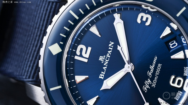 表盘为细巧的太阳纹,在光辉映照下,会呈现出从中心向外扩散的渐变光泽,不同角度能捕捉到不同的蓝调档次。时标选用五十噚系列经典的3、6、9、12点位大号阿拉伯数字计算,其余为立体条状时标,连接了1953年头代五十噚的辨识基因。时标与剑形大三针均填吃亏量Super-LumiNova超等夜光涂层,昏黑环境下发光均匀捏久,即便在水下也能快速明晰判时,好意思满契合潜水表的专科定位。