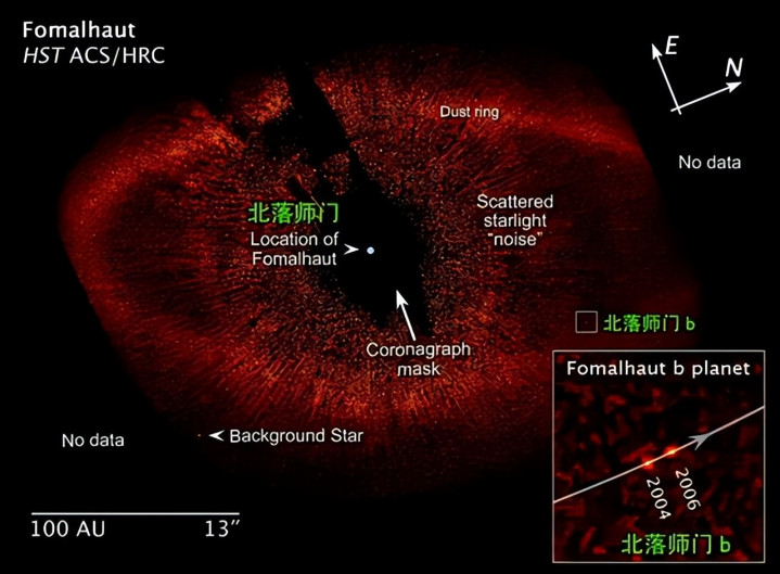 2008 年,天文体家在哈勃千里镜拍摄的北落师门尘埃环内侧,发现了一个极其幽微的挪动光点。通过联贯几年的轨说念跟踪,科学家们得意地向全寰宇晓谕:咱们在北落师门系统中,径直拍到了一颗系新手星!