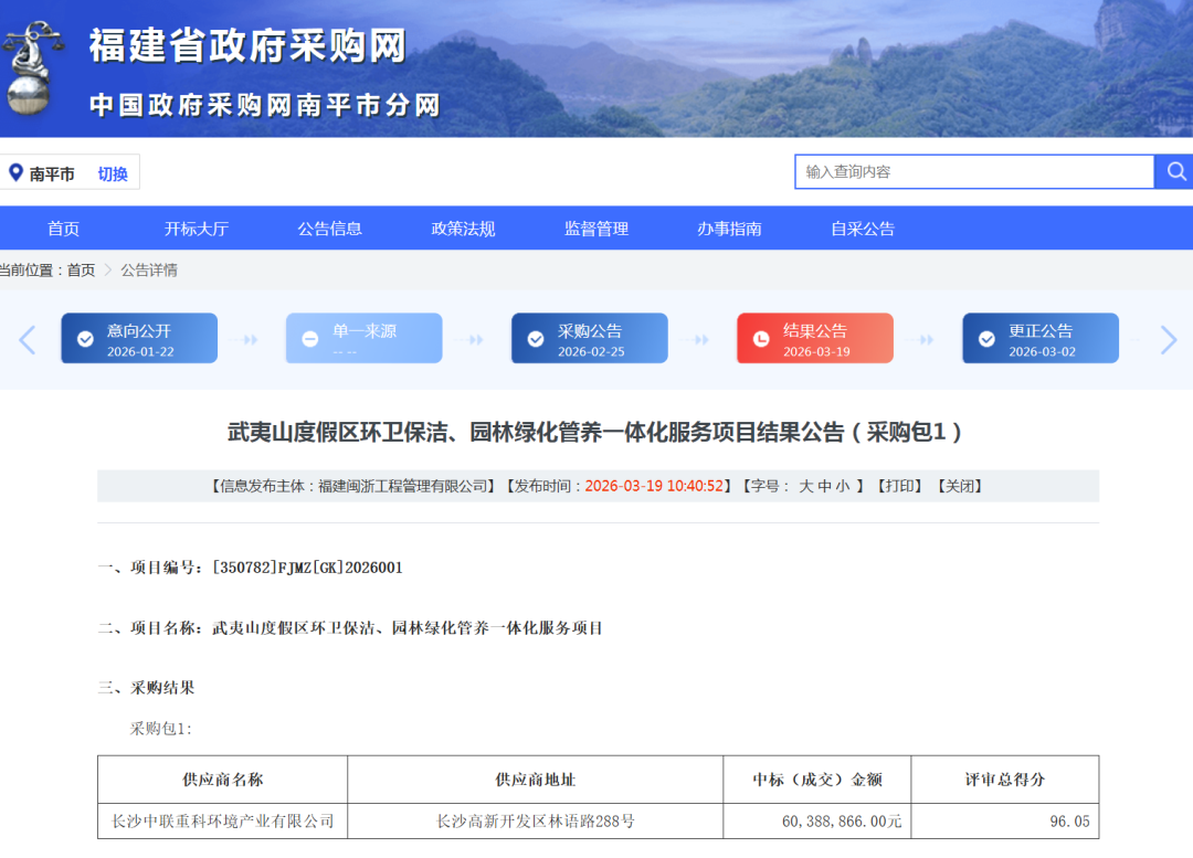 福建省政府采购网音信,3月19日,武夷山度假区环卫保洁、园林绿化管养一体化劳动技俩公布开标后果,盈峰环境[000967]子公司长沙中联重科环境产业有限公司以60,388,866元的报价成交,劳动期3年。