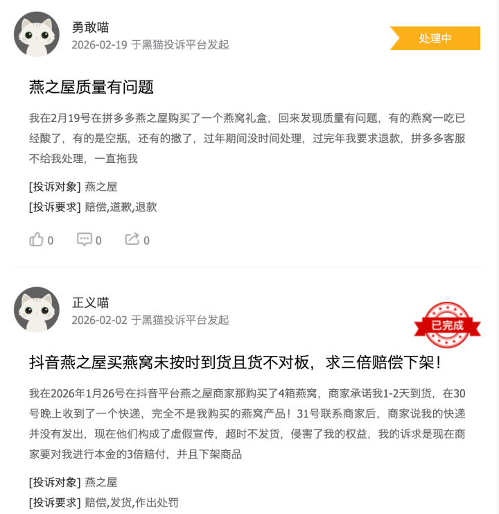 在黑猫投诉平台上,对于燕之屋的投诉也不少,投诉包括质地问题、瑕疵宣传、货不合板等。