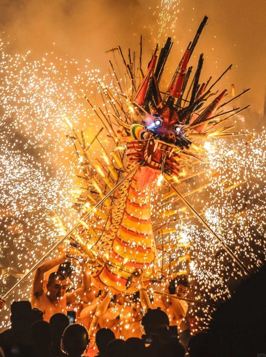 梅州流传着千年非遗丰顺埔寨火龙,是祈求天平地安的习惯。数十名赤膊青年手擎火龙腾空而起,加上鲤鱼灯和烟花、炮竹加持,总会引得东谈主们欢欣若狂。