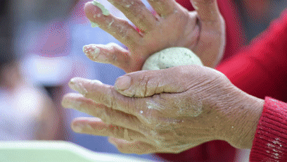 △艾粄。艾叶反复捶打至黏稠状,揉搓至与米粉团互相交融。