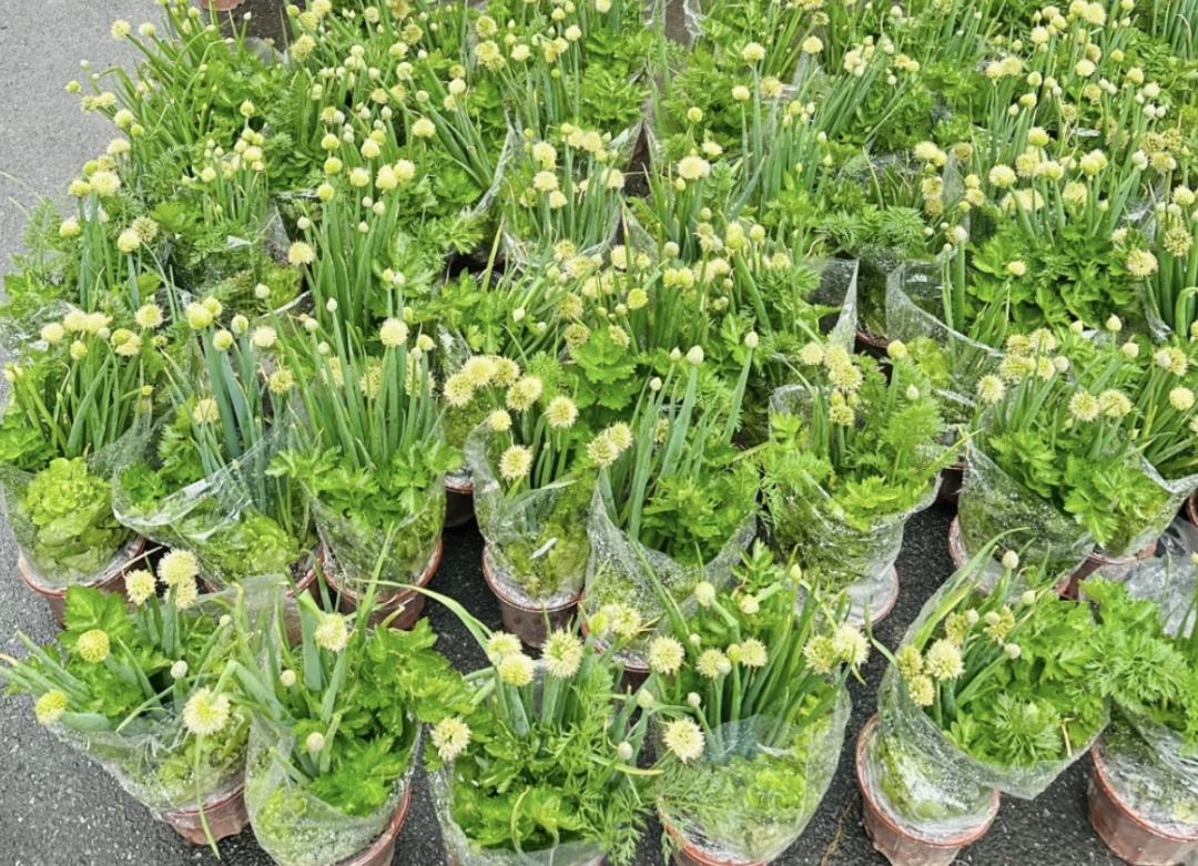 此外,由芹菜(致力于)、生菜(生财)、葱(颖慧)组成的盆栽,形似聚宝盆的蝴蝶兰也在花市里遍地可见。