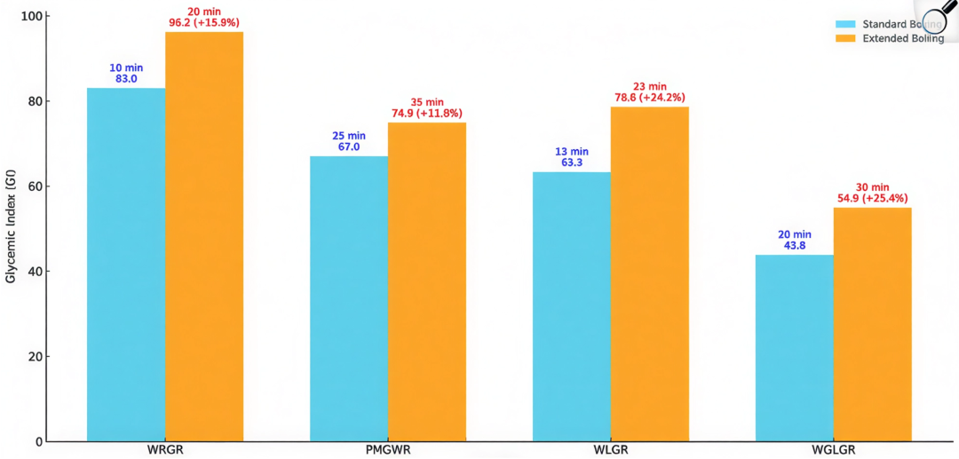不同品种的大米在蔓延水煮工夫后,GI数值均有进步