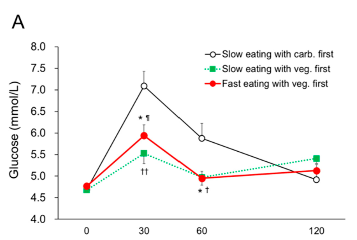 [7] Imai S, Kajiyama S, Kitta K, Miyawaki T, Matsumoto S, Ozasa N, Kajiyama S, Hashimoto Y, Fukui M. Eating Vegetables First Regardless of Eating Speed Has a Significant Reducing Effect on Postprandial Blood Glucose and Insulin in Young Healthy Women: Randomized Controlled Cross-Over Study. Nutrients. 2023; 15(5):1174. https://doi.org/10.3390/nu15051174